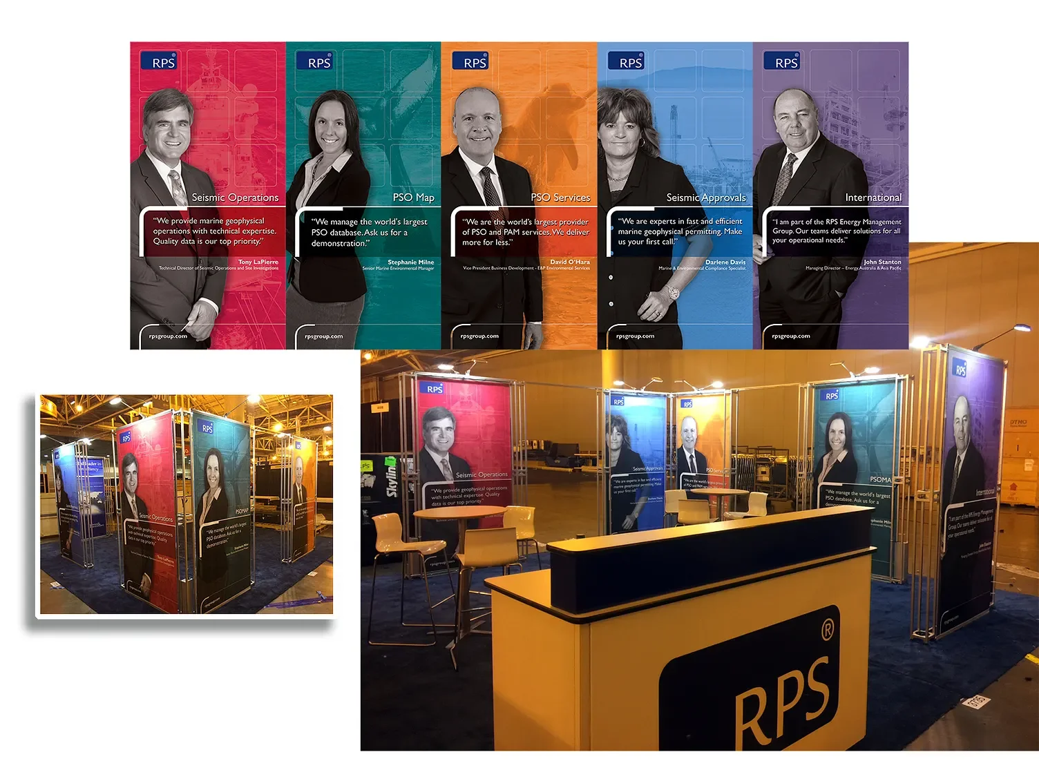 The use of real employees in the booth design helps humanize the RPS brand, drawing more attention than generic technical imagery typically would. At the Society of Exploration Geophysicists (SEG) Conference, RPS highlighted its services supporting the energy sector—a field that is both highly technical and, at times, controversial. Featuring actual staff members created a more approachable and authentic impression, particularly since the individuals depicted were present onsite, engaging with attendees at the booth.